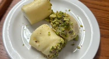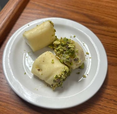 A delectable Arabic dessert made from rolls of soft, sweet cheese dough that gets stuffed with clotted cream, and crowned with pistachios.
