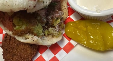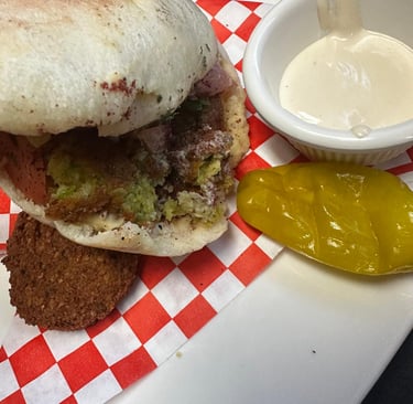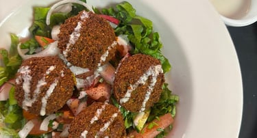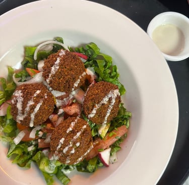 Lazeez’z Falafel, lettuce, tomatoes, cucumber, onions, cilantro, Mediterranean spices, and parsley. Served with Tahini sauce.