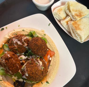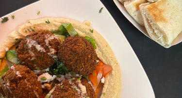 crafted Falafel with Hummus, salad; mixed with parsley, cilantro, and other Mediterranean spices. Served with Pita bread and Tahini sauce.