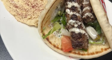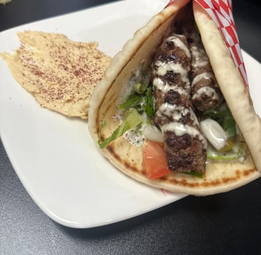 Ground beef mixed with onions, parsley, and a special blend of Mediterranean spices. Served with Hummus, tomatoes, onions, pickles, and fresh parsley. Wrapped in Pita bread with a spread of Tahini sauce.