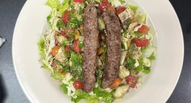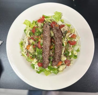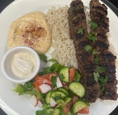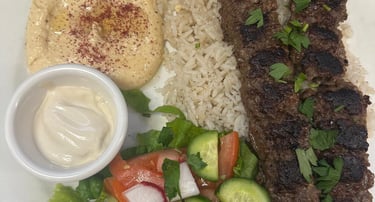 Ground beef mixed with onions, parsley, and a special blend of Mediterranean spices. Served with Hummus, rice, fresh salad, and Pita bread. Tahini sauce served on the side.