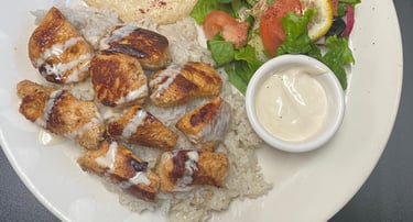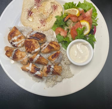 Your choice of cubed, grilled meat served with Hummus, rice, fresh salad, Pita bread, and Tahini sauce drizzle. Garlic or Tahini sauce on the side.