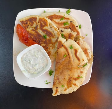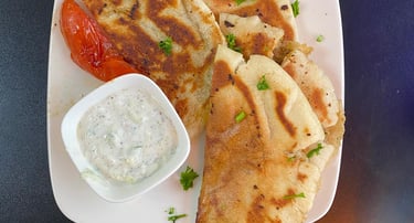 Grilled Pita pockets stuffed with ground beef, tomatoes, onions, and chili peppers. Topped with parsley and a side of Tahini or Tzatziki sauce.