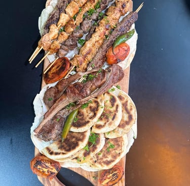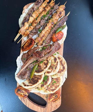 Mediterranean barbeque containing a variety of Kabobs served with rice, pita bread, and 3 sides of your choice. 4 Kebab skewers, 4 Sheesh Tawouq skewers, 5 lamb chops, and 6 pieces of Arayes. 3 sides: French fries, Arabic salad, Hummus, or Baba Ghanoush.