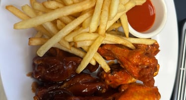 6 chicken wings tossed in Buffalo and Barbecue sauce, and one sauce of your choice.