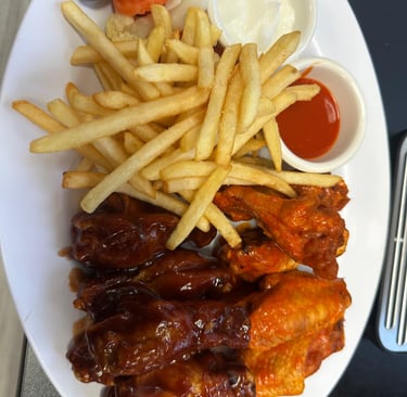 12 chicken wings tossed in Barbecue sauce, and two sauces of your choice.